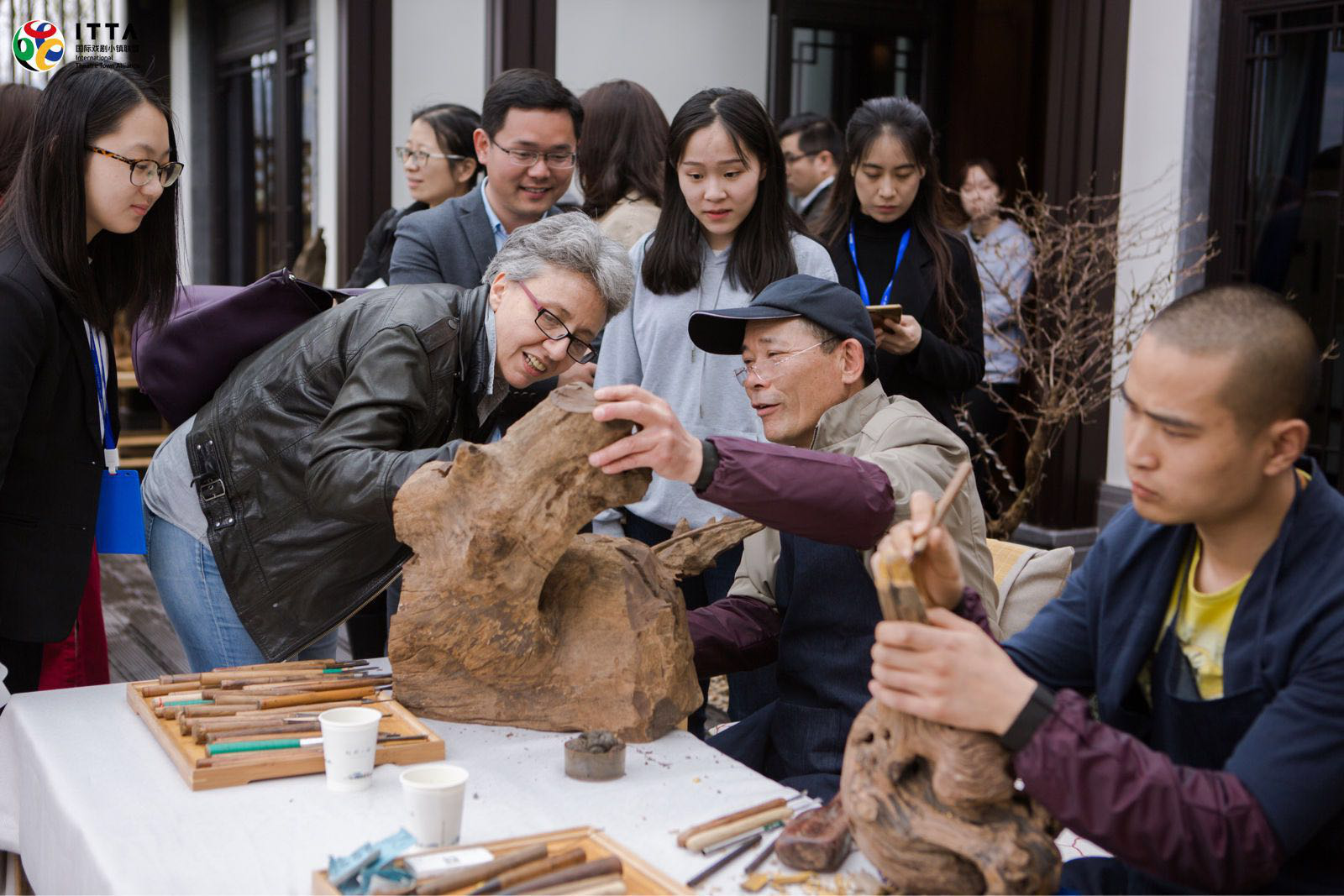 走进越剧小镇,院落里嵊州本土的竹编、根雕等手工艺非遗引起了理事们的兴趣。
