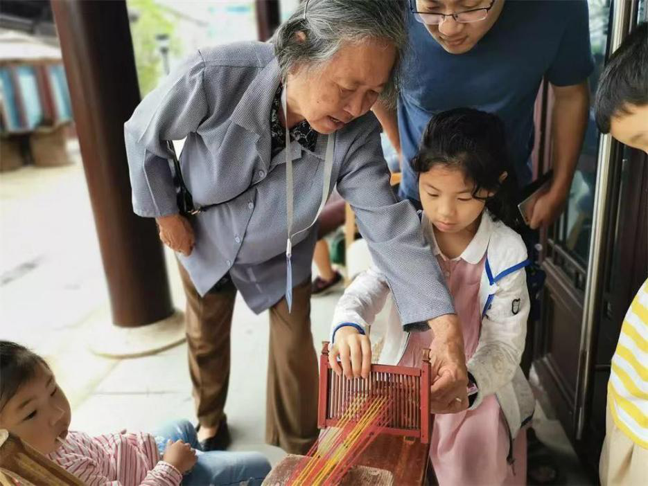 小游客在梁国芹老人的指导下尝试排花带